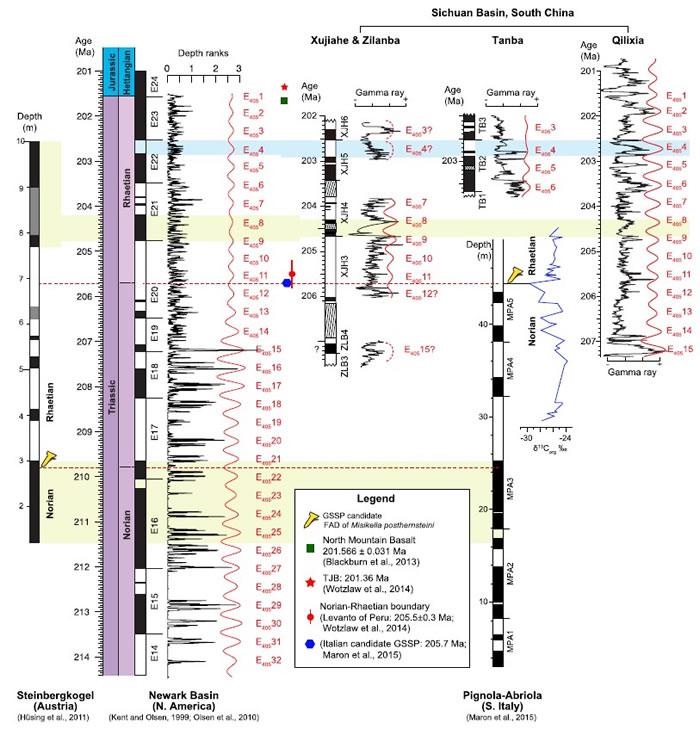 地球自转和绕太阳公转的天文轨道深刻影响了万年到十万年级别的全球气候变化和地层旋回韵律,同时地球磁场在过去频繁而全球同步进行倒转,这都为地层的定年和全球对比提供了可能和依据。长期以来,国际上晚三叠世的地质年代标准依赖于北美地区纽瓦克超群的天文旋回和古地磁极性年表。但是,这一北美标准的完整性和可靠性数十年来不断受到多个国际团队的挑战;对于晚三叠世的地质年代学,尤其是对晚三叠世最晚期的瑞替期(Rhaetian)持续时间等一直存在争议,因此科学界迫切需要来自全球不同地区的研究检验北美标准的适用性。