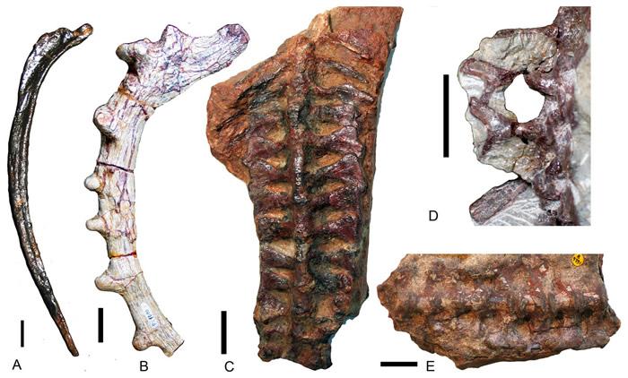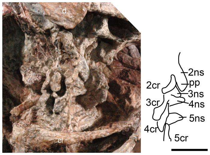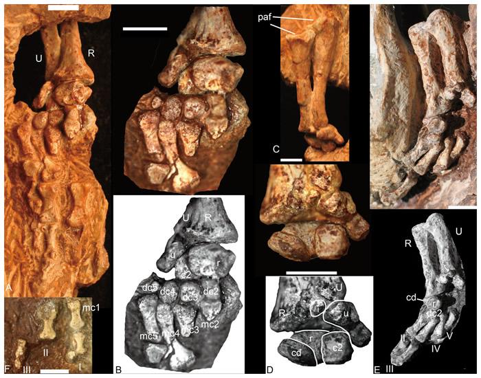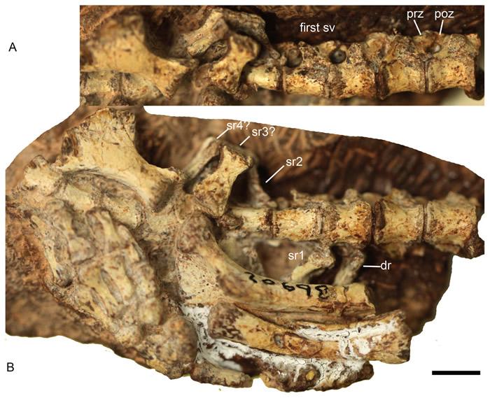 如同大多数犬齿兽类研究一样,横齿兽类的研究主要集中在头部(重点是牙齿),而头后骨骼却所知不多。本文研究的北方阔齿兽标本来自于北卡的一处砖厂,材料很丰富。其牙齿替换方式的相关研究已经于2010年发表在《古脊椎动物学报》。这些标本有几件保存了较好的头后骨骼,为这一类群中少有的。本文详细报道了其头后的形态特征,如4个荐椎及4对荐肋,其背肋骨为普通形态,肱骨内上髁边缘圆滑,有第五远侧腕骨。
