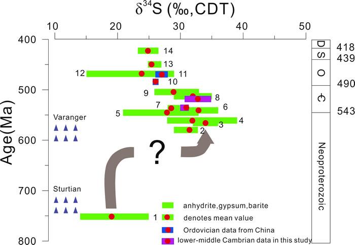 研究发现,在塔里木盆地奥陶纪早期的蒸发岩中,硫同位素下降到26.1‰;在鄂尔多斯盆地奥陶纪中期的蒸发岩硫同位素也在27.1‰至28.0‰之间。Yudomski事件自新元古代冰期之后出现,一直持续到寒武纪中期,而在寒武纪晚期结束。