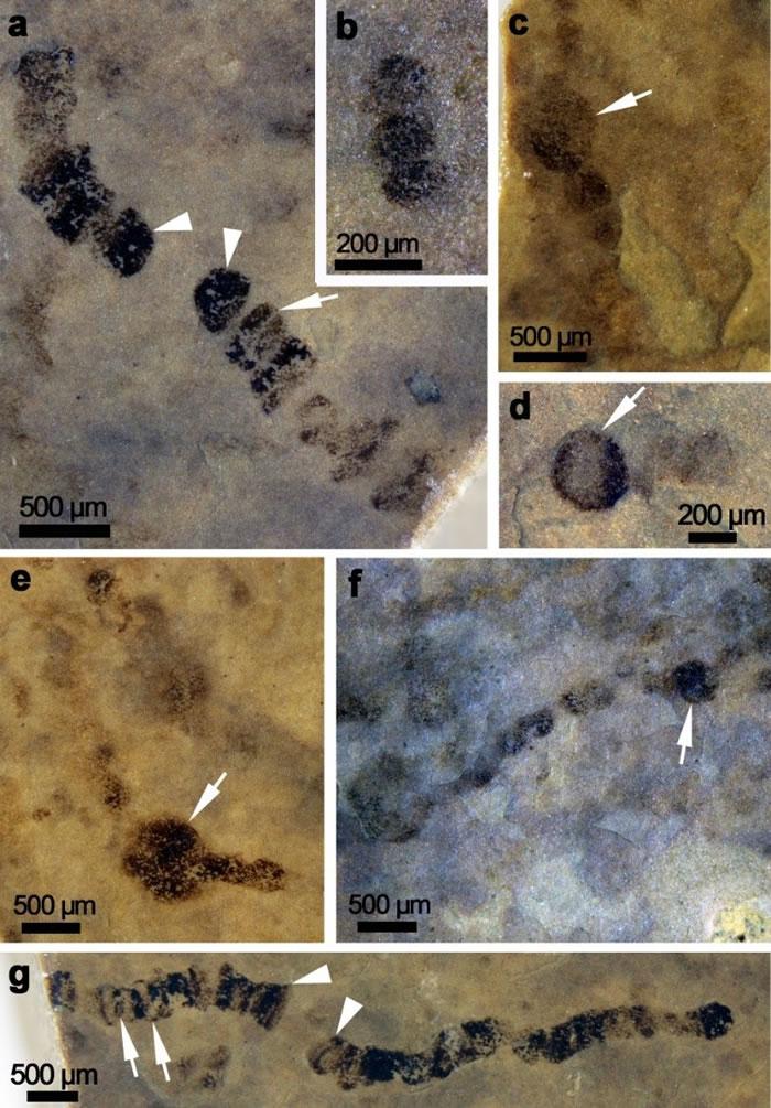 新元古代早期刘老碑组中具异形胞蓝藻化石。图a为保存在岩石手标本表面,主要由大型安徽丝藻(箭头所指)构成的肉眼可见的微生物席。图f中箭头所示为厚壁孢子