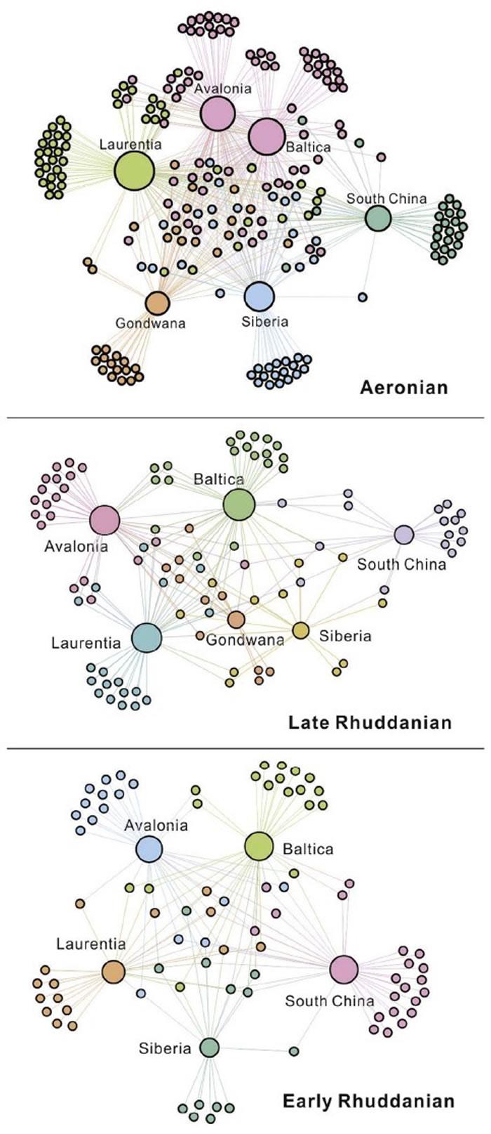 该研究基于已发表的资料及最新数据整理,通过来自6个古板块共计809个出现信息,建立了全球腕足动物从志留纪初鲁丹(Rhuddanian)早期(残存期)、鲁丹晚期(复苏早期)到埃隆期(复苏晚期到辐射期)的数据集。运用网络分析法,首次用网络参数平均度、图密度以及模块度拟合了古生物地理研究中的广布性及分区性。