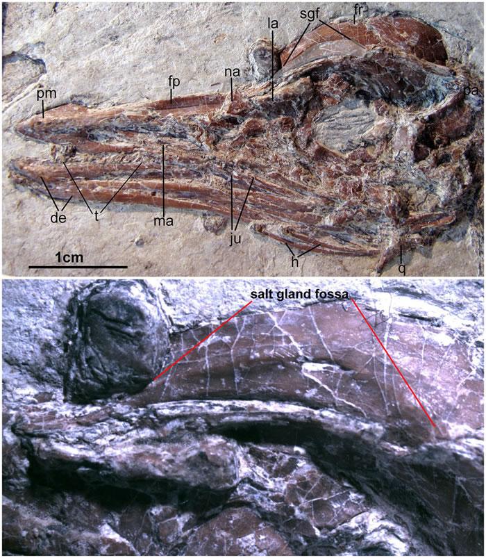 盐腺是分泌离子和矿物质的特化外分泌结构,是部分鸟类和爬行类所具有的排盐腺体,因位于眶部又叫眶腺。分泌物的主要成分是氯化钠。生活在海水环境中的海鸟的盐腺尤为发达。这些动物以海产的无脊椎动物和海藻为食,食物中的盐分很高。动物进食后,会使体液的渗透压过高。通过盐腺排出体内多余的盐分借以保持体液的渗透平衡。而本报道中的今鸟类化石出土于湖泊沉积环境的热河生物群,暗示了热河生物群生态环境的多样性,为热河生物群古生态环境的重建提供了一定的线索。该化石收藏于安徽省地质博物馆。