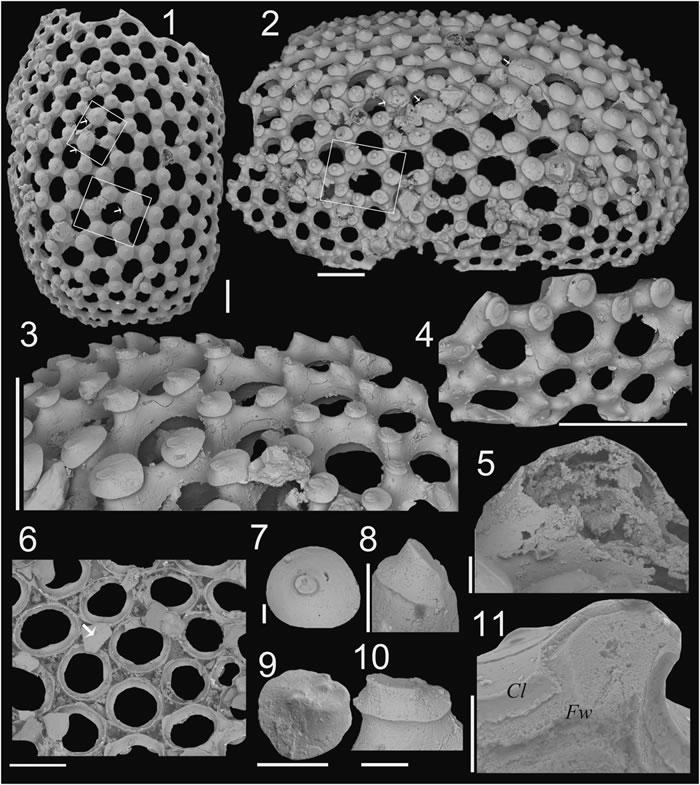 辛集组中的骨片形态与之前报导的某些离散骨片种有许多相似之处(椭圆形强烈隆起的框架、低矮的蘑菇状纽结、分散的纽结顶端等),但又具有一些新的特征,如蘑菇状纽结顶端呈表面平坦的平台状和纽结表面的放射纹。考虑骨片数量较少,无法排除个体发育与种内变异的影响,所以暂时将其当作微网虫未定种(Microdictyon sp.)。文章系统地总结微网虫各个种的时空分布特征,认为微网虫并不适合作为寒武系第三阶的标准化石。通过分析离散骨片的不同形态特征在地层中出现的先后顺序,发现高的纽结出现时间较晚,而低矮蘑菇状纽结可能是一种较为原始的特征。