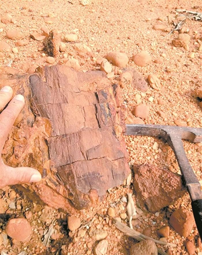 赵灿辉告诉记者,今年年初,他到三水盆地西部一处曾发现恐龙骨和恐龙蛋化石的工地搜寻,看能否有新的发现。结果,他看到地面露出一块有着树木一样纹理的石头。他走前细看,怀疑眼前的石头正是之前在博物馆见过的“硅化木”。