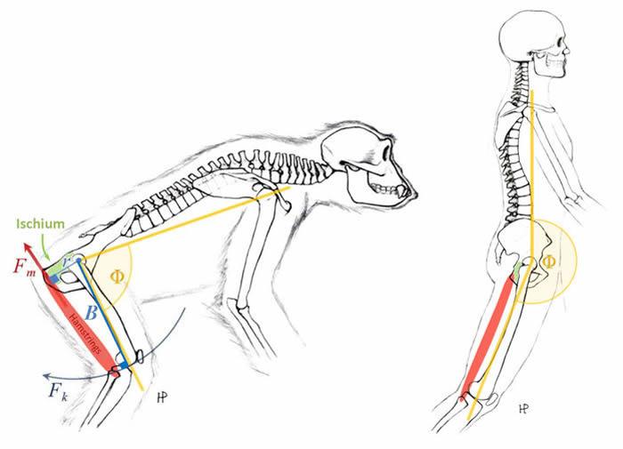 相反,拥有较短坐骨的人类以一种在膝部肌腱处产生较小力量的方式超伸其腿部。当人类大步走时,和其他现存猿类相比,附着在坐骨上的肌肉以更宽的弧度从前向后摆动。因此,他们利用了较少的能量移动更远的距离。