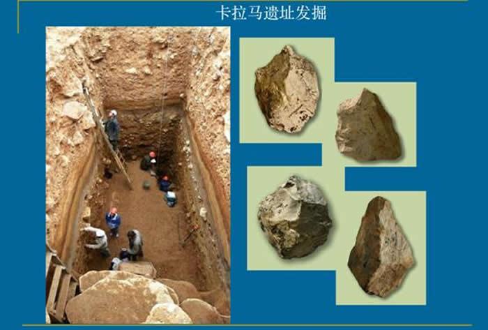 阿尔泰地区的卡拉马遗址是北亚地区最早的考古遗址,发掘所获地层明确,年代可靠,在年代最早的文化层中出土有早期石器,与非洲奥杜威的石器相似,是最早的砾石石器,根据地质学方法断代可知年代距今约80万年。