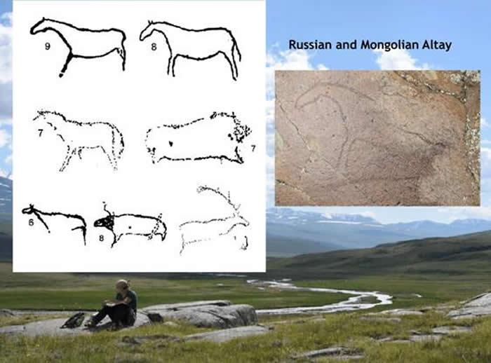 近年来,俄罗斯学者在阿尔泰的乌科克高原及相邻的蒙古国西部地区发现了大量的旧石器时代晚期岩画。该地区几乎每年都发现有新的岩画,其中的动物形象包括牛、马、鹿、犀牛、猛犸象等。这些岩画的规模比较大,但保存不完整,岩画风格与法国过去发现的一些岩画较为相似。