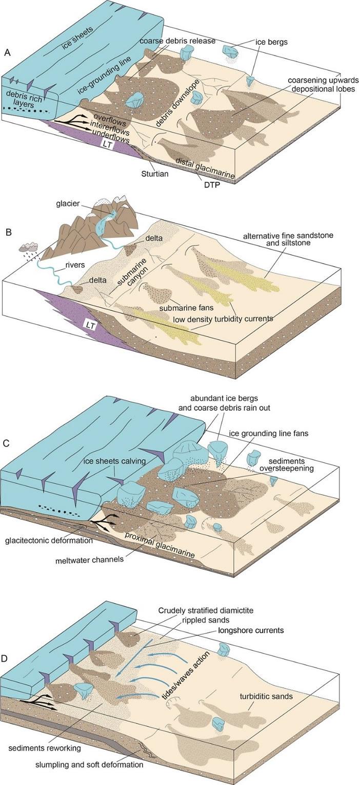 近日,中国科学院南京地质古生物研究所博士后郎咸国与北京大学沈冰研究员等人对我国华南南沱冰期演化过程进行了系统的研究。通过对浅水相、斜坡相以及盆地相的4个野外剖面和2口钻井岩芯的系统沉积相分析,识别出了10种岩相,并总结出3个岩相组合类型:冰川近缘相组合、冰川远缘相组合以及非冰川沉积。南沱组的相组合变化在横向上,具有很好的可对比性,表明冰期过程中的冰盖为动态活动的,存在多次冰进-冰退旋回。在相分析的基础上,恢复了南沱冰期过程中的冰川动力学演化过程,并将南沱冰期划分为4个演化阶段,识别出两次冰川发育鼎盛期。南沱组中部存在的细粒碎屑岩及碳酸盐岩夹层,代表了两次冰盛阶段之间的冰川消融期。南沱组顶部的含砾粉砂岩或粉砂岩沉积则表明南沱冰期的消融要早于陡山沱组盖帽碳酸盐岩的沉积。