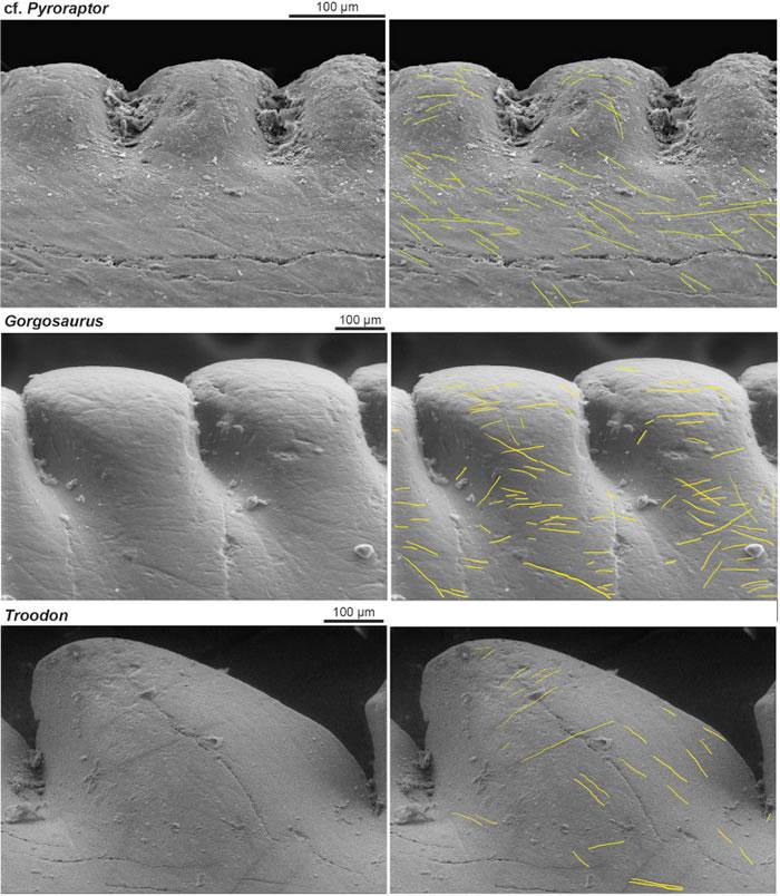 Torices团队首先检查了恐龙牙齿上的小划痕,以便弄清恐龙的饮食方式。她和加拿大阿尔伯塔大学的Ryan Wilkinson等人还使用了一种名为“有限元分析”的建模方法,以探究恐龙牙齿在不同的切割角度下的表现。