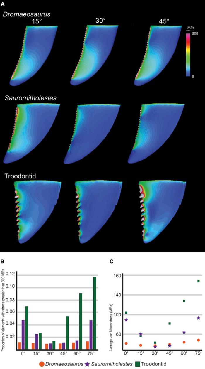 两种方法都得出了相同的结论。研究人员报告说,研究中所有恐龙都采用了“刺穿”式的进食动作,而且,不同的牙齿形状在不同的模拟咬角下表现不同。有证据表明,驰龙类和蜥鸟盗龙类很擅长处理挣扎中的猎物。相比之下,伤齿龙类的牙齿更可能在棘手的咬合角度上失败,但它们更喜欢温和的猎物,例如无脊椎动物,或者可以整个吞食的或者是像腐肉这样的不移动猎物。