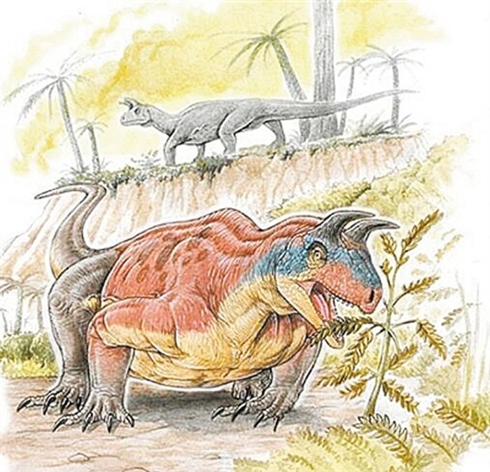 既然是吃素的,那么犄龙脑袋上的角肯定不是捕猎用的。古生物学家认为犄龙脑袋上的角是雄性的视觉展示物,也应该是雄性间搏斗的工具,所以只有雄性犄龙才长着角。