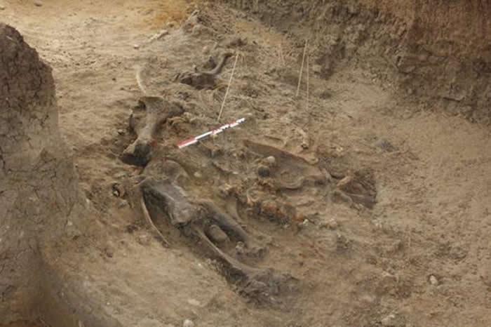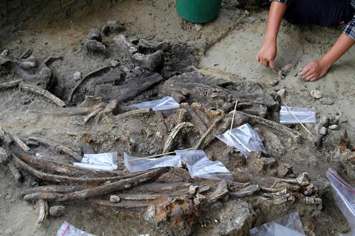 这次考古最大发现是一副犀牛骨架,完整程度大约75%,上有13处切口和敲击痕迹,显示曾有古人类肢解、分食这头犀牛。不清楚古人类是猎杀这头犀牛,还是只是发现它的尸体。