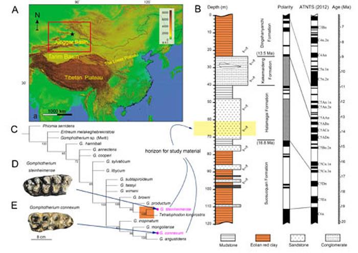 研究材料的地理位置、地层背景与嵌齿象属的系统发育树(吴妍供图)