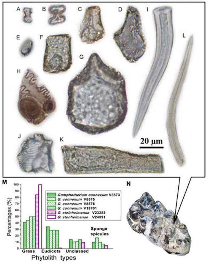 若说研究者是如何揭开施泰因海姆嵌齿象1600万年前进食的隐私,这还是要归功于之前提到的植硅体。研究人员在施泰因海姆嵌齿象臼齿的牙结石中,发现了植硅体的存在,而这些植硅体,正是这些已成为化石的古代象类祖先生前进食的植物所遗留下来的!植硅体非常坚硬,虽然对于吃它们的动物是严重的考验,但它们形态稳定,容易保存。更重要的是,研究者能够从它们的形态推断出它们的母源植物。通过显微观察,研究者发现,施泰因海姆嵌齿象臼齿牙结石中,所有的植硅体竟然都是来自草类,没有一个植硅体是属于非草类的植物,因此,施泰因海姆嵌齿象已经是一个严格的食草者,这一结果也与稳定同位素的方法及牙微磨痕方法得到的结论一致。这要比它的后代进化出适于食草的臼齿提前了1000万年以上,甚至在这个时期,地球上是以温暖湿润的森林环境为主,大规模的草原还没有出现。研究者进一步研究了新疆准噶尔盆地在中中新世的气候环境演变,通过分析地层中的花粉数据,发现在中中新世的新疆准噶尔盆地,气候比其它地区提前出现了干旱化的趋势,可能一些小范围的草原在这里已经出现,这或许就成为施泰因海姆嵌齿象以草为食的先决条件。