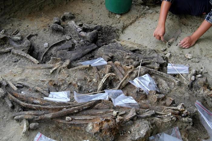 为了测定遗址的年代范围,团队测量沉积物和犀牛的牙齿中经过时间自然吸收的辐射量。此外,由于铀会随着时间衰变为钍,他们也测量了一颗犀牛牙齿中的天然铀含量。他们还在犀牛骨骸周围的泥土中发现78万1,000年前因小行星撞击而生成的熔融玻璃碎屑。