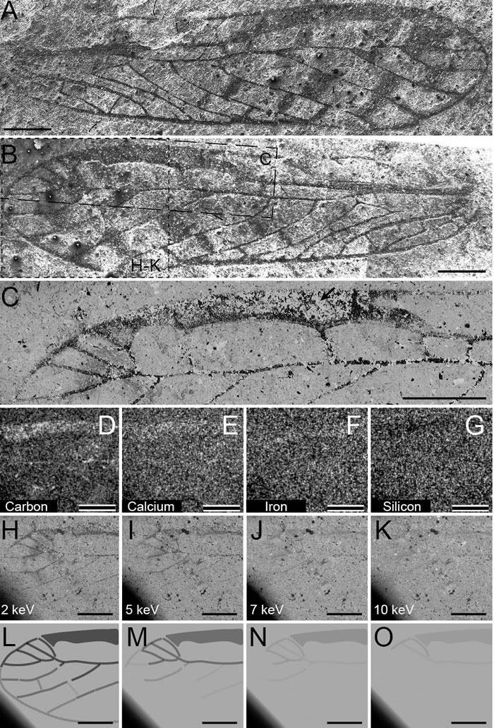 短脉螽科昆虫化石翅膀的扫描电子显微成像及能谱分析:电子束Z轴对比