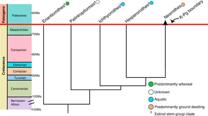 科学家们认为,在小行星撞击之前只有少数现代鸟类祖先存在,包括鸡和鸭的远古祖先。这些原始鸟类从地面收集食物而不是通过空中,这些原始鸟类被认为能够克服一切困难。