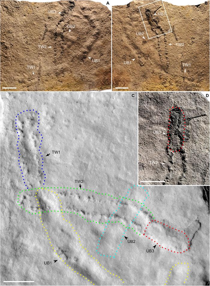 在中国发现的足迹显示了两排排列成重复组的印记,表明离留下它们的动物是两侧对称动物- 它们有双腿。这些足迹在洞穴附近被发现,这表明这些生物可能是为了寻找食物或氧气。