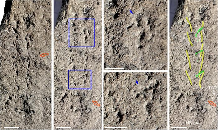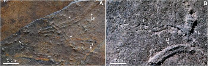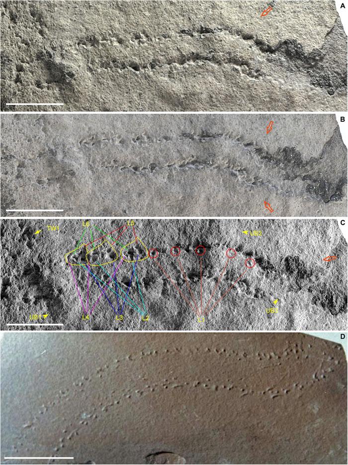 这些化石中反复出现不规则的两排印迹,科研人员推测它们可能是某种“两侧对称动物”的附肢踏出的“脚印”。