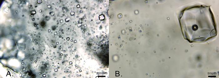 奥陶纪石盐中的原生(左)与次生流体包裹体(右)
