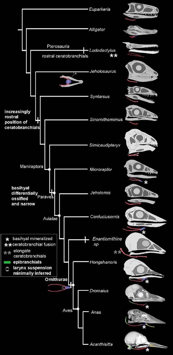 一种演化趋势因此清晰可辨:随着飞行能力的获得,一些似鸟恐龙已经不能用“手”来处理食物,这时候舌头就逐渐成为重要的处理食物的辅助工具。舌头变得越来越灵活、坚硬,两边的舌骨就越来越长,直到在舌头前端慢慢合拢,产生了一个新的骨化中心——基舌骨。