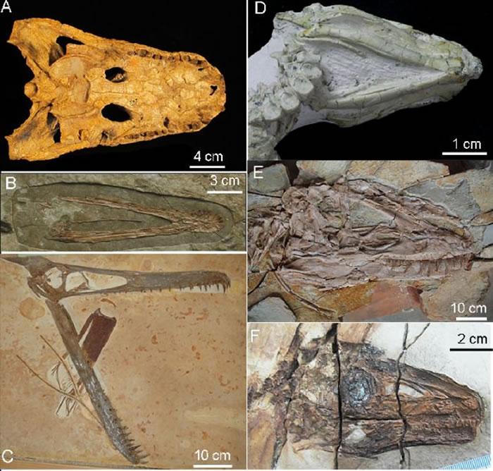 图为舌骨化石在主龙化石里的保存,其中A是前鼻短吻鳄;B为辽西翼龙;C是玩具翼龙,D是热河龙,E是羽王龙,F是中华龙鸟。