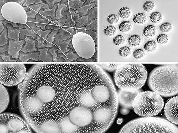 将团藻(拥有数百个细胞的藻类)与其相对简单的亲缘物种——单细胞衣藻(左上)和拥有4~16个细胞的盘藻(右上)作对比,揭示了向多细胞生命发展的步骤。