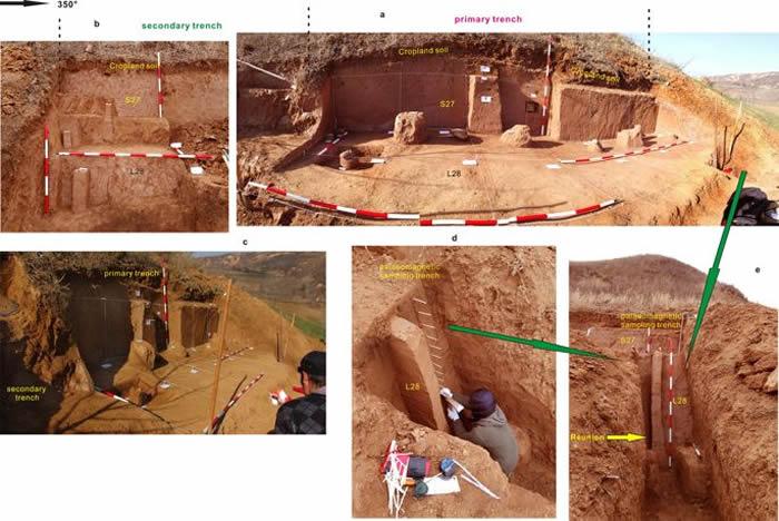 研究工作围绕在西安市蓝田县上陈地区发现的出露良好、层位连续的风成黄土-古土壤序列剖面(L5~L28)展开。研究团队对剖面开展了土壤地层标志层与黄土-古土壤地层剖面的测量及层序对比、沉积物粒度组成分析、矿物学组合与地球化学组分测试、各类岩石磁学方法测试、系统的退磁和古地磁极性测量,在数千组数据的基础上,建立了多旋回黄土-古土壤的土壤地层序列和古地磁年代序列。研究团队在上陈遗址剖面顶部的古土壤S5(距今0.46 Ma)至底部L28的20多个原生地层层位中陆续发现了就地埋藏的石器,而在发表的论文中重点讨论了更新世早期S15古土壤(距今约1.26 Ma)至L28黄土(距今约2.14 Ma)的17个层位中(11个古土壤层位和6个黄土层位)发现的石器。这些石器包括石核、石片、刮削器、尖状器、钻孔器、石锤以及手镐和两面器等,并伴随有哺乳动物化石残骸和碎片。根据上陈遗址一系列的旧石器层位首次建立了一个黄土高原南部早更新世“黄土-古土壤-旧石器文化层序列”框架,证明了这段时期古人类在蓝田地区的反复出现(是否连续出现尚待研究),并且主要出现于古土壤发育时期。最老的石器发现于S27~L28原生层位中,并伴有多种哺乳动物化石残骸。最老层位的位置位于古地磁松山反极性世的奥杜威正极性亚时与留尼旺正极性漂移磁性层之间,在留尼旺漂移层之上约70cm。依据古地磁年龄并参考前人建立的黄土-古土壤序列轨道调谐年龄序列,最老石器层位的年龄距今约2.10~2.12 Ma。