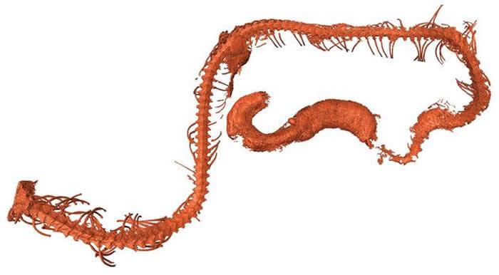 加拿大艾伯塔大学生物系主任迈克尔·考德威尔(M ichael W . Caldw ell)教授研究了标本的3D形态,发现它有着明显的腹下椎骨(前泄殖腔椎骨),一共87节,推测总共有160节。而且标本的脊椎骨还有着特化的椎弧凹与椎弧凸,这是蛇类的重要特征。这两个结构互相镶嵌着形成球状窝,使得蛇的每一节脊椎骨都能牢牢相扣,并且又能转动灵活。
