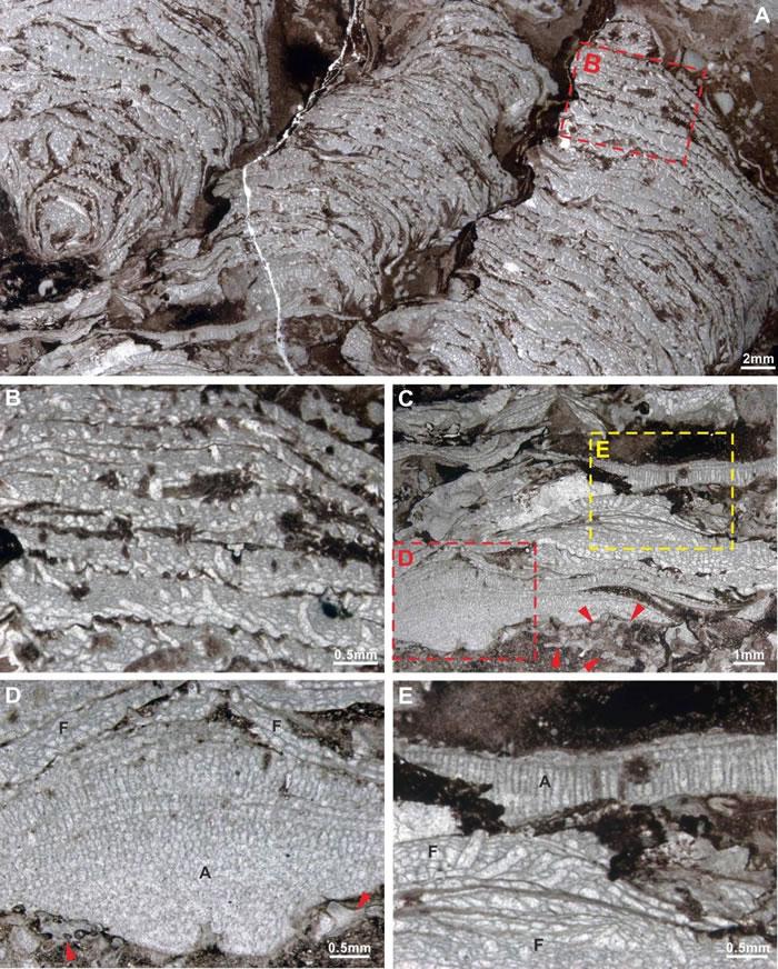 壳状苔藓虫格架岩薄片照片。B为A中红框放大部分,显示笛苔藓虫的细节。D和E分别为C中红框和黄框放大部分,显示不同属的壳状苔藓虫相互堆叠的情况。