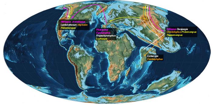 根据系统发育和祖先类群的古地理分布重建早始新世奇蹄类的迁徙路线。粉色、白色、橙色,和黄色名称和线条分别代表马、雷兽、角形类,和爪兽类群及迁徙路线(白滨供图)