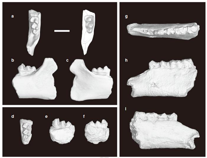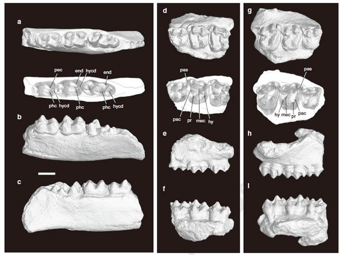 湖南最早始新世岭茶组的早期爪兽衡阳原爪兽? (Protomoropus? hengyangensis Young, 1944) (a-f)和早期雷兽棱齿丹江兽(Danjiangia lambdodon sp. nov.) (素描许勇绘)
