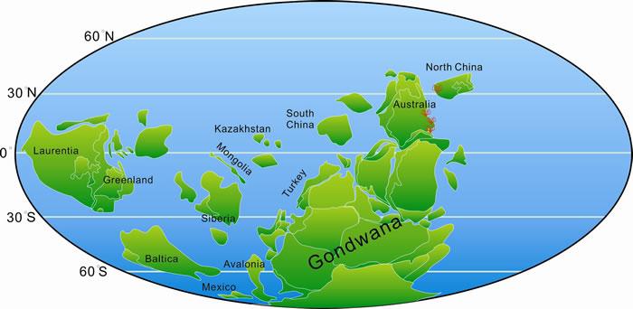 寒武系第二统托莫特壳化石Paterimitra pyramidalis的古地理分布(古地理图修改自Torsvik and Cocks, 2013b; Yang et al., 2015)