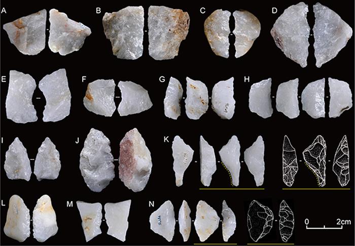 许昌人遗址出土石器:a,b刮削器;c,d锯齿刃器;e,f凹缺器;g,h石钻;i,j,k尖状器;l,m卵石毛坯的工具;n修背工具。k中黄色虚线指示尖状器底部的修理(李浩供图)