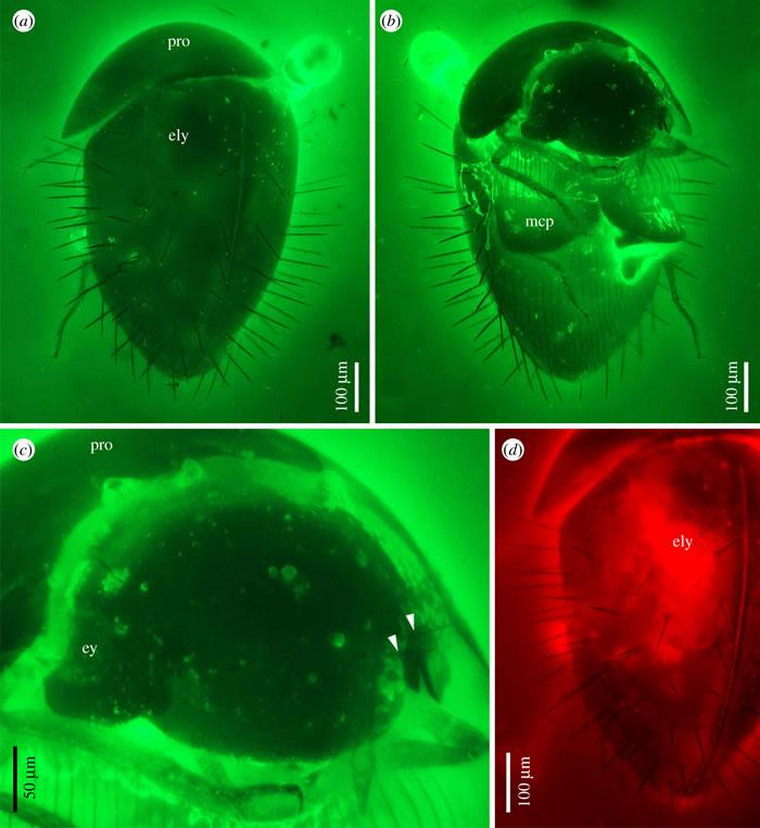 拳甲科是多食亚目中一个小类群,现生5属,约150种,其体型较小,全球广布。成虫常见于腐木,腐败的植物或落叶层中。“拳甲化石十分罕见,目前仅有两例化石报道,均发现于琥珀中。”蔡晨阳告诉《中国科学报》记者。