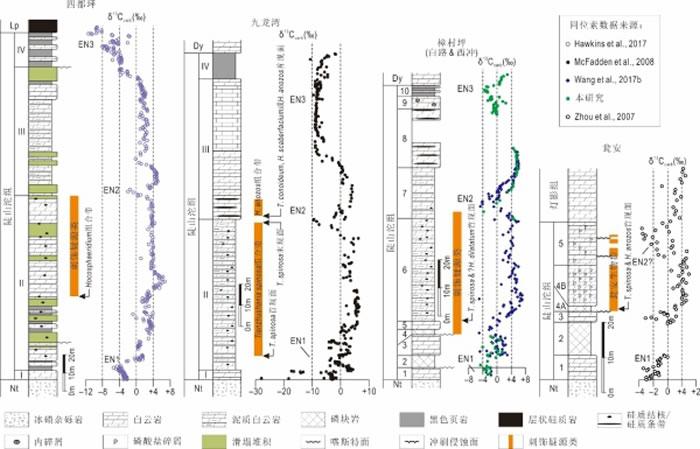 进一步,通过岩石、碳同位素和生物地层对比,他们发现过去报道的樟村坪与瓮安地区微体化石组合之上的一次碳同位素负漂移更可能相当于三峡地区陡山沱组中部的负漂移,而非三峡地区陡山沱组近顶部的一次全球范围可以广泛对比的负漂移。这说明瓮安生物群以及樟村坪微体化石组合的地层时代与三峡地区的硅化疑源类下组合上部相当。