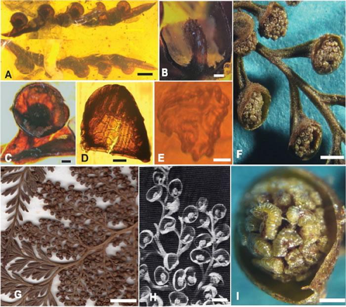 缅甸琥珀研究新类群——白垩密锥蕨化石(A-E)与现存密锥蕨(F-I)