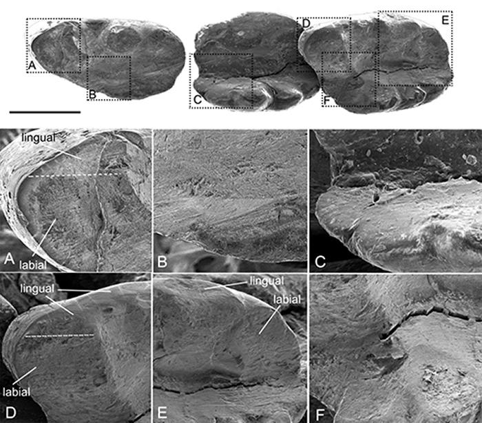 济赞堂奇兽牙齿磨痕的SEM显微结构,显示磨蚀面,磨痕及其分布(毛方圆 供图)