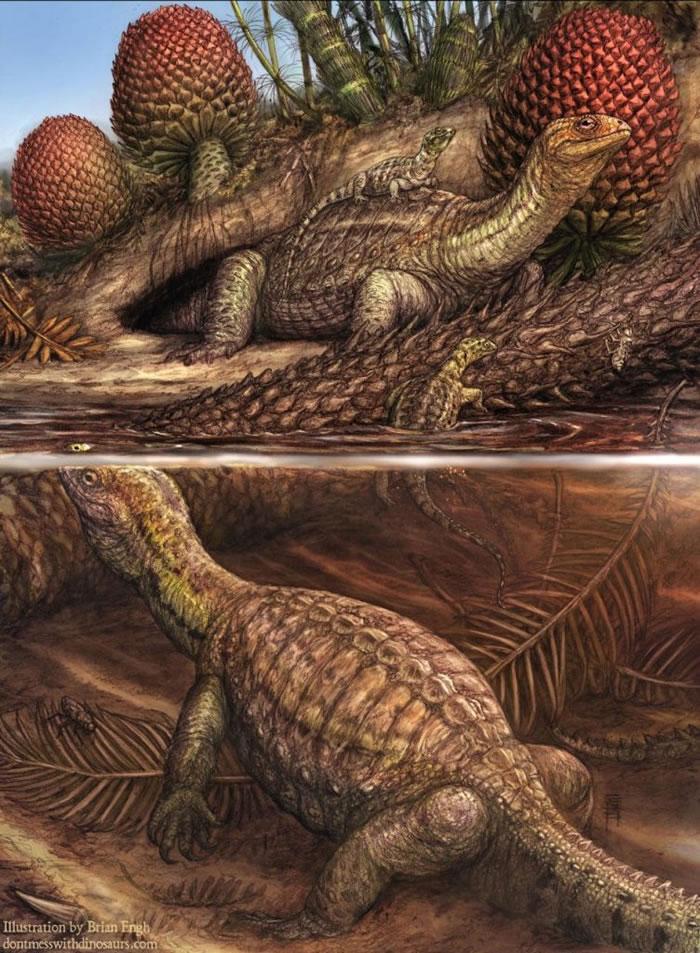 插画中一群无壳的罗氏祖龟(Pappochelys rosinae)正在探索一座三叠纪湖泊。 ILLUSTRATION BY BRIAN ENGH