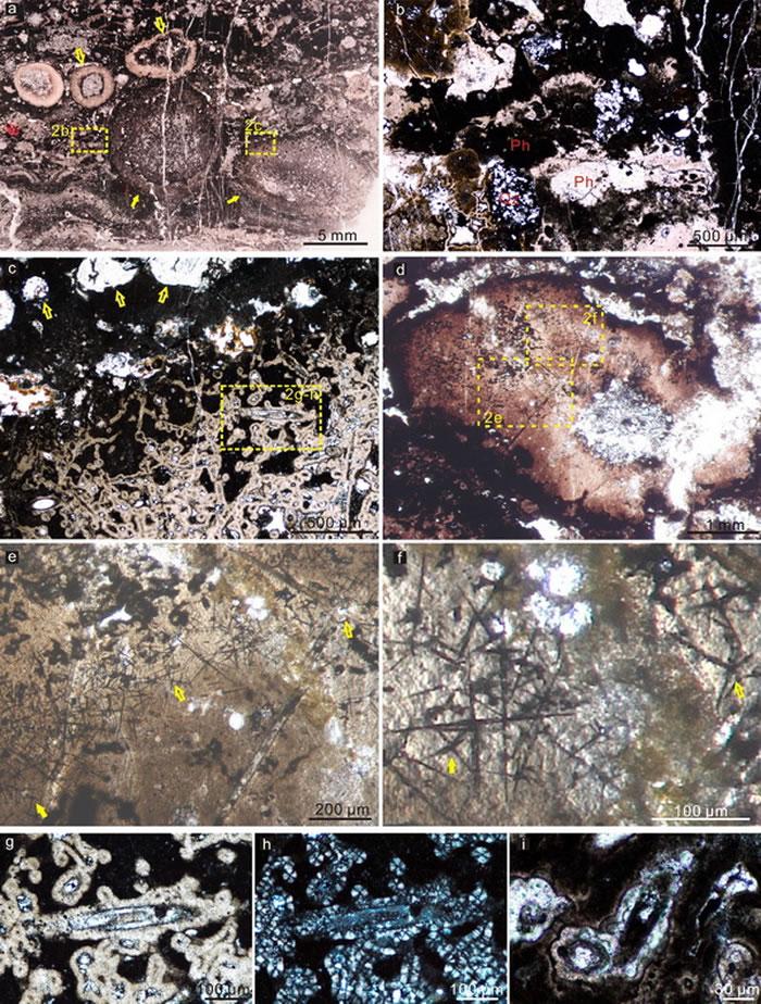 这套磷块岩位于牛蹄塘组镍-钼富集层之下,依据前人的放射性同位素定年和生物地层学研究,推测其沉积时间不晚于寒武纪第二期。原位保存的海绵化石以结核的形式赋存于富碳的硅质磷块岩中,其围岩具有指示自生成因的层状、团块状隐晶质磷酸盐沉积结构,而缺乏机械搬运沉积颗粒。一些化石的骨架被完全包埋在隐晶质的磷酸盐沉积中;而大部分化石的保存状态是骨针首先被等厚、具十字消光特征的隐晶质磷酸盐胶结物所包裹,剩余的骨架空间被更晚期的磷酸盐、石英和焦沥青(pyrobitumen)所充填。