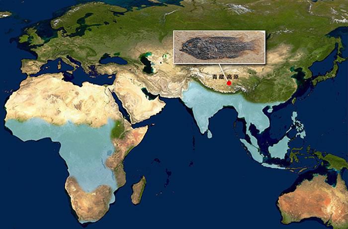 现代攀鲈分布区(蓝色)及青藏高原攀鲈化石产地(红圆)。化石为西藏始攀鲈正模标本,现存于中科院古脊椎动物与古人类研究所(吴飞翔供图)