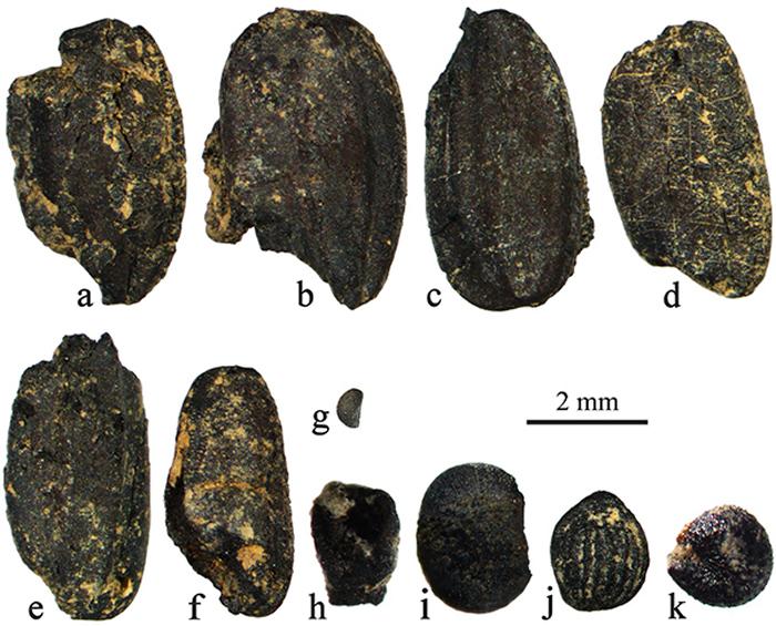 茶岭遗址若干单位出土的炭化植物遗存(a-f:水稻)