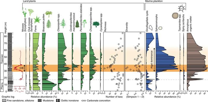 近期,瑞典自然历史博物馆古生物学系Slater等通过孢粉研究为回答上述问题提供了重要证据,成果发表于Nature Geoscience期刊(Slater et al., 2019)。孢粉是植物产生的孢子和花粉,因其数量大、抗腐蚀能力强,可以在古老地层中较好地保存下来。因此,沉积物中的孢粉组合已被广泛用于重建古植被演化及气候环境状况。Slater等在英国早侏罗世普林斯巴赫期及图阿尔期(Pliensbachian–Toarcian)浅海陆架沉积的页岩中获取了丰富的陆生植物孢粉和海洋浮游生物化石。结合沉积学及同位素研究,Slater与合作者重建了陆地生态系统对图阿尔期变暖事件的完整响应过程,发现此次变暖事件引发了陆地植物群的巨大转变。