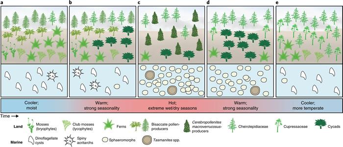 (化石网报道)据中国科学院地质与地球物理研究所:基于陆生植物孢粉及海洋浮游生物微体化石的研究显示,早侏罗世全球变暖事件(图阿尔期大洋缺氧事件)不仅破坏了海洋生态系统,也对陆地生态系统带来重大影响,且对陆地生态系统的影响明显早于海洋。