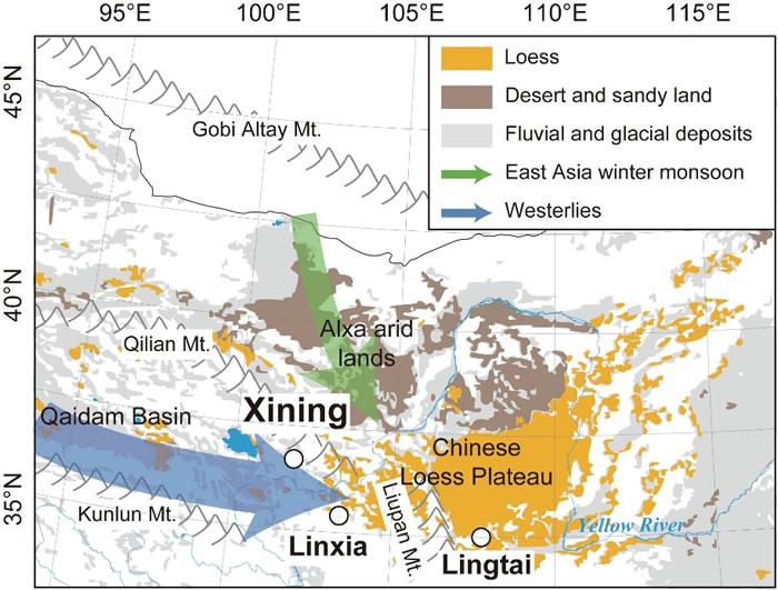 西宁盆地、临夏盆地和黄土高原灵台风成沉积序列位置,以及推测的中新世至上新世期间东亚冬季风和西风带盛行位置与方向。