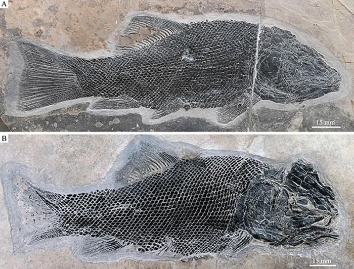 两块罗平强壮鱼化石标本 (A为正型标本)(徐光辉 供图)