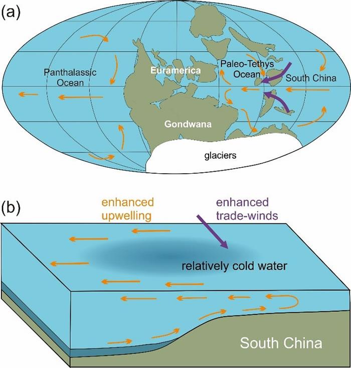 越过石炭系中间界线时,研究剖面均显示一个小幅度的δ13Ccarb正漂移(0.5-1.0‰)。华南相对欧美大陆较小的δ13Ccarb值正漂移,很有可能是由增强的上升流作用所导致(图)。华南斜坡相剖面没有经历大气淡水成岩作用,δ13Ccarb值保存良好,且由于上升流作用增强,底层水与表层水混合良好,而且华南板块位于泛大洋和古特提斯洋之间,所有这些证据都指示华南斜坡相的δ13Ccarb值或许能够代表当时全球海水溶解无机碳的平均值,这对生物地球化学循环等定量研究具有重要意义。
