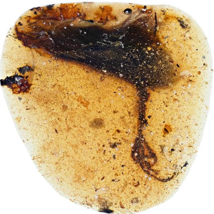 这只新种反鸟类的后肢被发现时包裹在一粒缅甸琥珀之中。 IMAGE BY LIDA XING