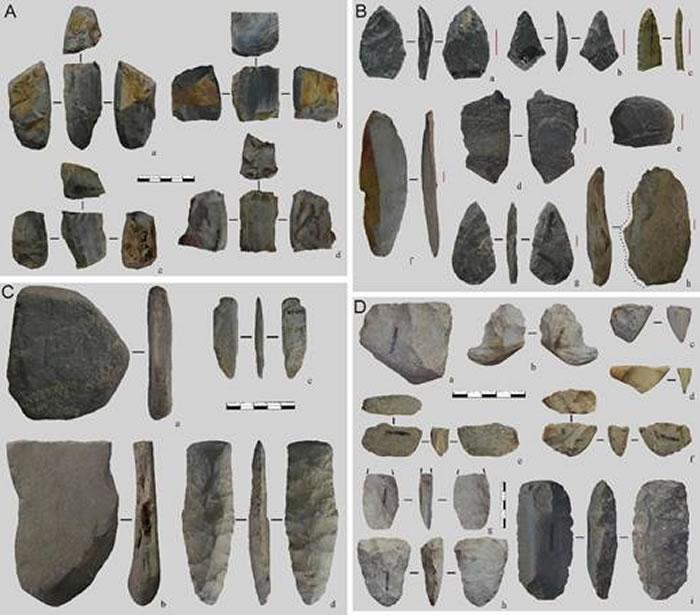 桦阳和桃山遗址过渡阶段出土的石制品。A-C)桦阳遗址第2文化层;D)桃山遗址第3层(岳健平 供图)