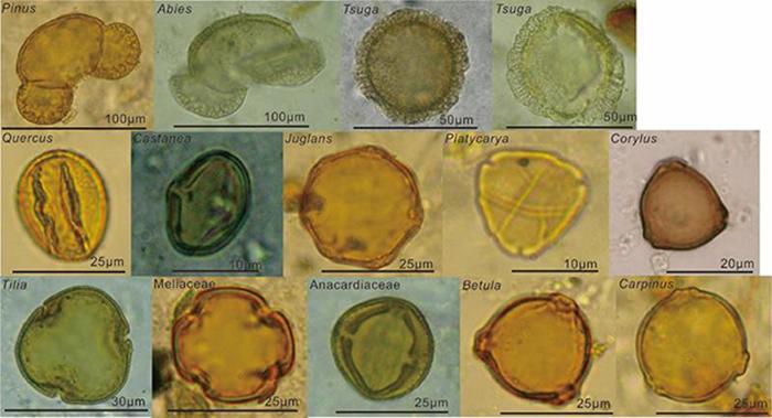 图1 乌帕尔剖面晚全新世沉积物中发现的远距离传播花粉类型:松属(Pinus)、冷杉属(Abies)、铁杉属(Tsuga)、栎属(Quercus)、栗属(Castanea)、胡桃属(Juglans)、化香树属(Platycarya)、榛属(Corylus)、椴属(Tilia)、楝科(Meliaceae)、漆树科(Anacardiaceae)、桦属(Betula)、和鹅耳枥属(Carpinus)(赵克良供图)